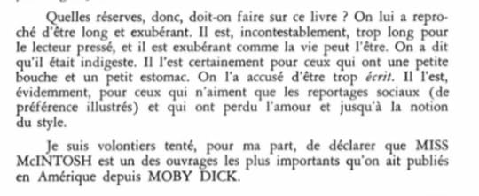 A sa parution, rares sont les lecteurs français qui ont lu et commenté le chef d'œuvre de Marguerite Young, Miss McIntosh, My Darling.On peut toutefois signaler le cas de Pierre Brodin, qui non seulement a lu alors le livre en anglais mais s'est également entretenu avec l'auteure. Il lui a consacré un bel article, qu'on peut lire ici.