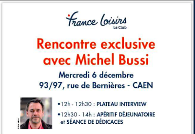 Je ne suis pas certain d'être libre le 6 décembre, même si la perspective de me rendre au 93/97 rue de Bernières à Caen pour aller voir Michel Bussi est assez excitante en soi. En revanche, je trouve le menu assez étrange. Commencer par un plateau d'interview, c'est moyennement ragoûtant. Mais continuer par un "apéritif déjeunatoire"…? Ce "déjeunatoire" me laisse perplexe. Déjà, dînatoire ne m'a jamais trop emballé, mais là… Par ailleurs, bous noterez que l'apéro est trois fois plus grand que le plateau. Que faire? comme disait Lénine…