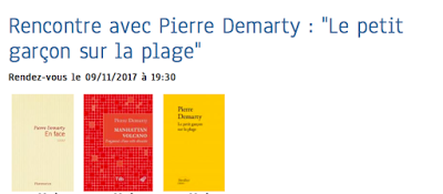 (éd. Verdier). Si vous l'avez déjà lu, vous serez ravi.e.s de rencontrer l'auteur, qui a écrit aussi deux autres livres (l'un à base de lave latine, l'autre potacho-immobilier) avec lesquels vous pourrez repartir (après les avoir achetés); si vous ne l'avez pas lu, même chose, mais avec trois livres au lieu de deux (sauf si vous déjà lu un de ses deux premiers livres, mais bon, ça s'offre aussi, les bouquins, pensez aux amis, et au libraire). Par ailleurs, sachez que Pierre Demarty est également un excellent traducteur, entre autres de Paul Harding (prix de la traduction Maurice-Edgar Coindreau) et de Vollmann (La tunique de glace), tous deux publiés en Lot49, renouant ainsi avec l'antique tradition de l'écrivain-traducteur, ce décadent dodo qu'aucun conquistador n'est encore parvenu à décimer.Le petit garçon sur la plage, je le précise, n'est pas un ouvrage jeunesse ni un récit balnéaire. C'est une histoire de filiation tranchée (ou pas), d'abandon impossible, et si vous cherchez bien vous trouverez même, nichée entre les lignes, l'ombre de Scarlet Johansson, planant au-dessus de la dépouille d'un enfant turc. Improbable? Non: poignant. Nécessaire. On posera donc à l'auteur la question suivante: Pierre, peut-être qu'être père va de pair avec la perte? Allez, on s'entraîne.