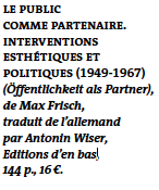 6/ Moins célébré qu’Elias Canetti, parce que sans doute plus humble, et moins acerbe que Thomas Bernhard, car habité par un doute socratique, Max Frisch partage avec ces deux écrivains un goût prononcé pour ce précieux mécanisme intellectuel qu’est la méfiance, et a par ailleurs toujours pris soin de dire ses quatre vérités à son pays, moins pour le rabrouer que pour se garder d’une trop facile neutralité.