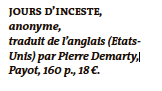 7/ « Mon père me regardait avec voracité », écrit l’auteure anonyme de Jours d’inceste, abusée jusqu’à l’âge de 21 ans par cet homme dont elle est la viande permanente, la poupée poignardée, contrainte de vivre avec un désir-dégoût du père qu’elle doit garder pour elle –
