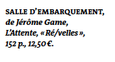 8/ Jérôme Game a pris soin de placer une phrase de Godard en exergue de son livre: «Champ. Contrechamp. Imaginaire, certitude. Réel, incertitude.» On comprend mieux. Qu’estce qu’on voit exactement? Juste un texte? Non. Un texte juste.