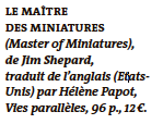 10/ Jim Shepard a réussi ce petit miracle : feindre de traiter l’anecdotique et le pyrotechnique pour nous livrer une poignante et impeccable sonate d’automne, où le désamour paternel, l’insatisfaction conjugale et l’angoisse de la perte forment les coordonnées sismiques d’un drame personnel mais non moins ravageur.p.p1 {margin: 0.0px 0.0px 0.0px 0.0px; font: 8.5px Helvetica} p.p1 {margin: 0.0px 0.0px 0.0px 0.0px; font: 8.5px Helvetica; color: #261100} p.p1 {margin: 0.0px 0.0px 0.0px 0.0px; font: 8.5px Helvetica} p.p1 {margin: 0.0px 0.0px 0.0px 0.0px; font: 8.5px Helvetica; color: #261100} p.p1 {margin: 0.0px 0.0px 0.0px 0.0px; font: 8.5px Helvetica; color: #261100}