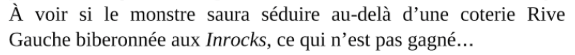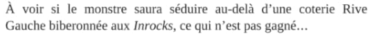 Qui sait? Peut-être l'ouvrage parviendra-t-il jusqu'à fasciner quelques lointains cénacles de province qui se shootent au Dauphiné Libéré ? En tout cas, le livre a déjà réjoui plusieurs dizaines de milliers de provinciaux anglais qui ne lisent sûrement que la Gazette de Manchester. C'est déjà ça.