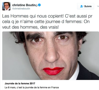 Oui, vous avez bien lu. De vrais hommes. Ma foi, cela pose un problème. Qu'est-ce qu'un "vrai" homme? Admirons au passage l'habile façon qu'a cette demeurée profonde de contourner l'épineux problème des 140 signes sur Tweeter. On appréciera le "que" (prononcez "queue") raccourci en "q" (prononcez "cul") ainsi que le "des" abrégé en "d", outre le fait que non, Christine, ce n'est pas la journée de la femme, mais de ses droits, hein.
