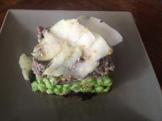 Prenez une bonne poignée d'algues mortes, genre dulse + laitue de mer + nori, laissez-les se prélasser langoureusement dans une cuillerée d'huile d'avocat, agrémentés d'un trait de citron et de trois grains de sel de Guérande.Faites cuire des petits pois frais dans de l'eau bouillante, au préalable salée (vous remarquerez que dans les recettes l'expression "au préalable" arrive toujours en fin de phrase…), puis égouttez-les sans vous brûler, plongez-les dans un saladier d'eau glacée, égouttez à nouveau (plaisir de la répétition), et mélangez-les à un pesto à la truffe blanche (ou aux champignons, hein), bricolez vite fait une petite fondue d'aubergine (sans oublier l'ail broyé, et en donnant un petit coup de girafe (oui, je sais)), puis découpez de translucides tranches dans un chou rave (exercice qui exige plus de doigté que si vous tentiez de décoller deux pages de Pléiade qui en fait n'en font qu'une), arrosez-les prudemment d'huile de sésame, et parsemez-les de grains de sésame tant qu'à faire.