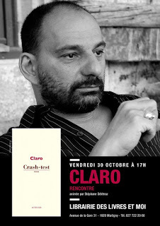 Demain, samedi 31 octobre à 16h, plutôt que de me déguiser en citrouille radioactive, je serai à la Librairie du Midi, à Oron-la-Ville, toujours en Suisse, pour une nouvelle rencontre autour de Crash-test. C'est une librairie chère à mon cœur, puisque ses proprios, Marie et Nicolas, ont réussi l'improbable exploit d'écouler plus de cent exemplaires de mon précédent roman, Tous les diamants du ciel. Et pas au même client ! Voici d'ailleurs ce que dit Marie Musy de mon dernier livre:"Claro nous revient avec un nouveau texte qui tient autant du roman que du poème. Crash-test est un livre sans jaquette, comme si le lecteur devait poser ses yeux, et ses mains, directement sur les mots. Ou plutôt sur les corps. A travers trois personnages (un ouvrier qui travaille dans la section «crash-test» d’une usine automobile, une strip-teaseuse et un ado qui découvre la sexualité avec des bandes dessinées pour adultes), Claro nous invite à une exploration des corps. Quelle est leur résistance, qu’en reste-t-il une fois mort, quel est le prix d’un corps et quel effet celui d’une femme a-t-il sur les hommes ? A toutes ces questions l’auteur répond avec une infinie poésie et un humour absolument décapant"En plus, ils m'ont arrangé une superbe vitrine, comme vous pouvez le constater sur la photo. Bon, pour être franc, tout n'est pas rose, et à ce propos j'ai une bonne et une bonne nouvelle à vous annoncer. La bonne nouvelle, c'est que dans cette librairie l'apéro commence à 16h. Cool, non? La mauvaise, c'est qu'un astéroïde de 470 mètres de diamètre devrait frôler la terre le même jour. Coïncidence? Je ne crois pas.
