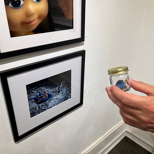 In Jar: plastic raft and rowers from photo“Plastiqueville [is] an imaginary world populated by my random collection of little plastic people. You will see their competitive nature as they compete at Scrabble. You’ll experience their adventurous spirit as they go rafting through waters made from foil paper. And you’ll be invited into their private moments as they share their secrets. Plastiqueville is a world like no other, although it will probably look very familiar,” Joan teased.