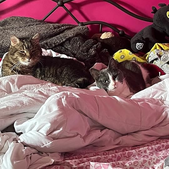 Then I came up to take my shower and Opie shot out of my room and Louise followed him. Louise is the tripod foster from Feline Urban Rescue and Rehab scheduled for adoption June 10. She hasn’t voluntarily left my room since I worked second shift. When the house was quiet at 1 a.m. she would normally follow me to the bathroom.