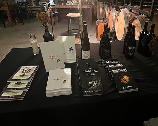 Bill went next with the opening of his novel, The Hanging Girl. The wines began with German-inspired white and progressed all the way to a dark, rich red called “Dark Angel” that the host paired with my reading from my second novel, Courting Apparitions.