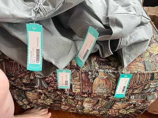When we got home I piled my shoes on the table and my cat Fog made himself a bed on the Stitch Fix shoe duster bags.