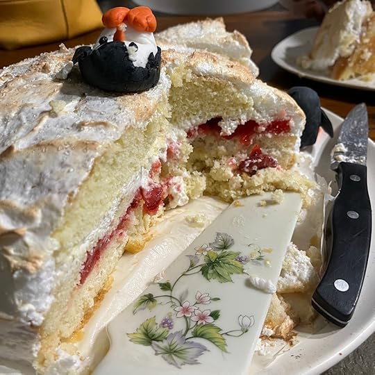 Yesterday, my mother-in-law brought down a birthday cake for the teenager, a baked Alaska decorated like an igloo. The dessert featured layers of cake and ice cream sandwiching a strawberry filling like a big old Kaiser roll, but the Kaiser roll was meringue caramelized in the oven.