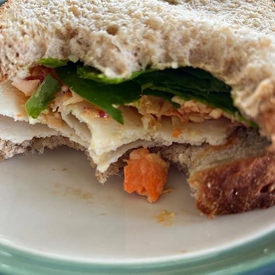 Today I made a leftover sandwich— some old smoked Turkey, slightly wilted lettuce and my coleslaw mix stirred into chipotle mayonnaise.