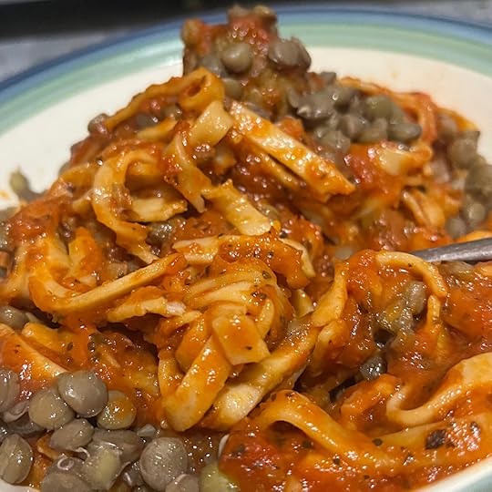 My lunch was leftover cauliflower linguine and one meatball from Hungryroot, basil tomato sauce from ShopRite and a pile of plain lentils I made.
