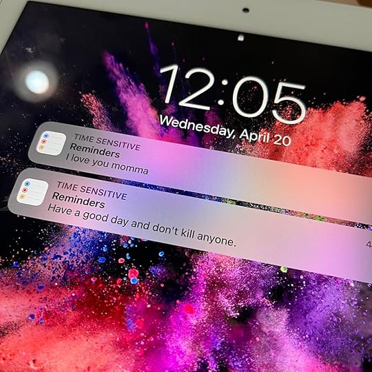 But luckily the teenager puts reminders like this on my iPad. “Have a good day and don’t kill anyone.”