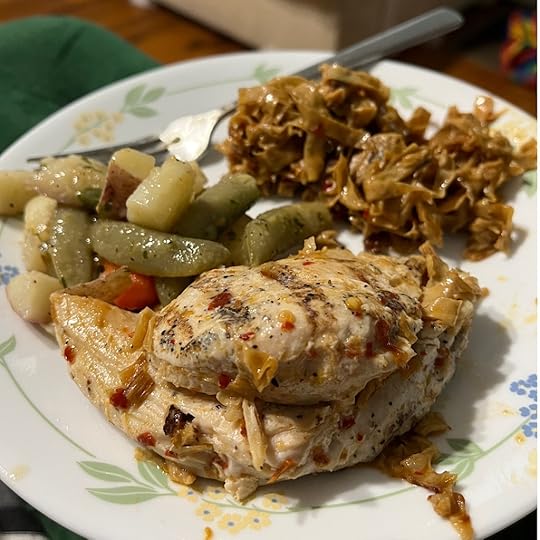 The teenager made dinner: the chicken breast I had leftover from our last Hungryroot box, youba noodles and vegetables. And then we watched the latest Spider-Man movie which featured all the Spider-Mans.