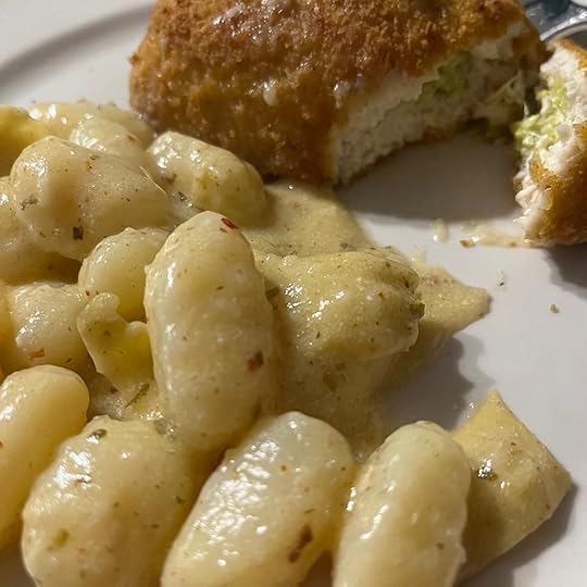My personal favorite cheap meal this month has been these gnocchi from the Dollar Tree, served with a cream sauce I made with butter, lemon, and some artichoke hearts (using the oil they were marinated in). The artichoke hearts and the Barber Foods Chicken Stuffed with Broccoli and Cheese came from Grocery Outlet. The whole meal cost me about $3 per serving. And I used up some half and half that was on its last leg.