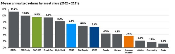JP Morgan reported that over 20 years, the S&P 500 had an annualized return of 9.5% while the average investor had an annualized return of just 3.6% (62% less).