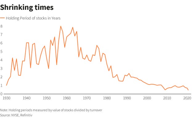 During the 1950s and 1960s, the average stock was held for more than seven years. By the 1980s the average was down to less than three years, and by the turn of the millennium it had fallen to less than one year. By June 2020 the average holding period had declined to just five and a half months.