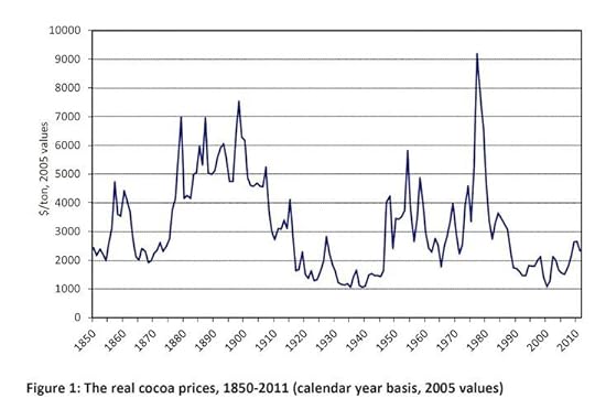 Looking at the graph, you do not need to be a genius to realize that cocoa prices are volatile. This is true about just about any other commodity (e.g. oil). Commodity prices are generally volatile because they are lot more sensitive to the fluctuations in supply and demand than manufactured goods. This makes economies based on commodity production (i.e. almost all of Sub-Saharan Africa) inherently unstable.