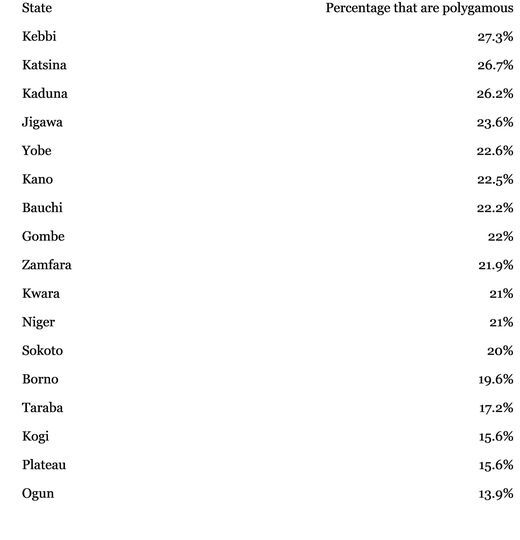 I will also say something about polygamy (specifically about polygyny where a man marries more than one wife). Polygamy was largely the norm everywhere until about the 6th century AD. Between the 6th and 9th century, things started to change in Europe as the Catholic church insisted that men could only take one wife and had a protracted battle with the European kings and nobility about this [6]. The church would eventually prevail and monogamy became the norm in the west. I think it is also worth pointing out that while polygamy permits marrying more than one wife, most men in places and times that permit polygamy, would of practical necessity have had at most, one wife. The laws of sexual inheritance from the field of Mendelian Genetics taught in about every secondary school biology textbook places significant limits on the number of men that can practice polygamy. As Mendelian Genetics ensures that in any suitably large population, roughly equal numbers of males and females would be produced, there simply wouldn’t be enough women to go around for the vast majority of men to have more than one wife. For the skeptics who need hard data, the following table is from the data service Statisense, which shows the top 17 states with the most polygamous men (ages 15-49) with at least 2 wives in Nigeria: