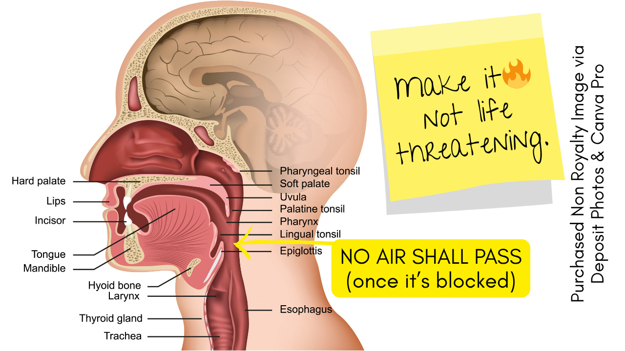 2. The Nose Won’t Save You If the Throat Is BlockedIf the epiglottis is closed (whether by violence or swallowing a certain something down the throat), nothing is getting to the lungs. That’s right, not even a desperate breath through the nose. If the trachea is blocked, it’s game over—no “gasping through her nose as he—” Nope. No air. None. This can up the stakes both in an action scene and well…that kind of action scene. But having your character breathe through their nose while there’s something lodged in their throat is going to make it seem like you write from whence you do not know.