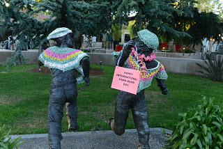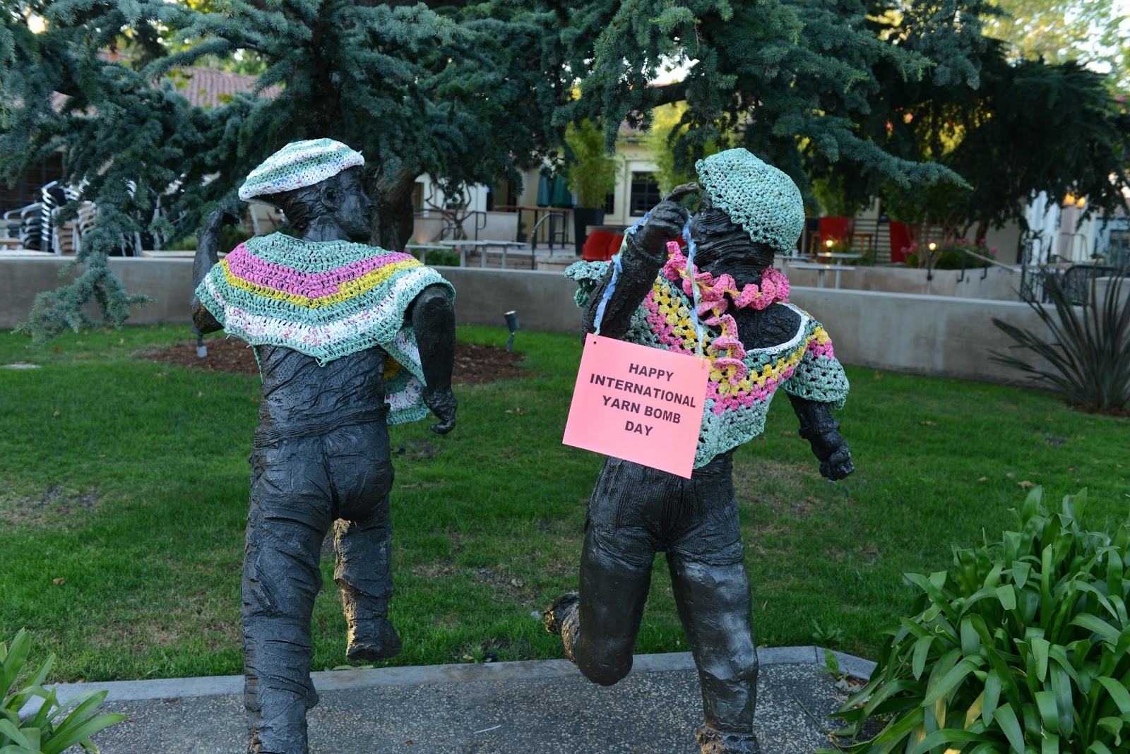 For some reason, a lot of people hate this piece of sculpture. They think it's ugly or stupid. I figure it's par for the course for public art. I felt like I could do something a little different than a standard yarn bomb and make clothing for the figures.