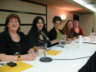 Nancy Kilpatrick, Sephera Giron, Chris Szego, Patricia Briggs and me! It was a great discussion about the appeal of monsters in romance, horror, urban fantasy and YA and I was super excited an honored to be sitting next to Patricia Briggs. Even more excited when she complimented me after, as did her husband, Mike, whom I had a great conversation with over a cup of hot chocolate when we couldn't squeeze into the too-small room where they held the opening ceremonies right after the panel. (With bagpipes!)