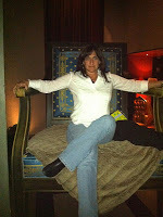 I had a lovely hangover run on the Embarcadero (where were you, Molly?) and then had total sticker shock at Bloomingdale's. Thank God for Macy's and the 40% off rack where Serena found me the perfect dress for an upcoming event. Then tonight it was dinner at Zingari's and off for an end of the evening cocktail at the Redwood Room. Where we took this awesome photo in the fabulous giant chair in the lobby: