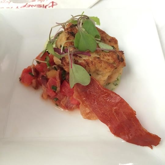 Chef Dave prepared a Rock Shrimp & Crab BLT. What an intriguing combination! The “B” was baked prosciutto the “L” was Boston Bibb Aioli and the “T” was beautifully prepared tomatoes. Chef Dave shared a great tip to “crunch” the prosciutto: Put the prosciutto on parchment paper in a baking sheet and then cover it with a second baking sheet.