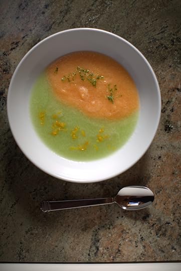 of the orange zest on the green honeydew soup side, and a pinch or two of the lime zest on the