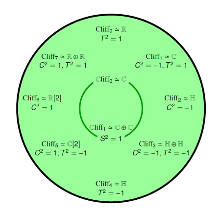 There are ten ways that a substance can have symmetry under time reversal, switching particles and holes, both or neither. But this fact turns out to extend far beyond condensed matter physics! It’s really built into the fabric of mathematics in a deep way.