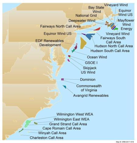 Massachusetts law requires that the state get 3,200 megawatts of offshore wind power by 2035. This would be about 20% of the electricity they consume. But so far they get only about 120 megawatts from wind, offshore and onshore. Most of the potential wind energy areas shown above have not yet been developed.