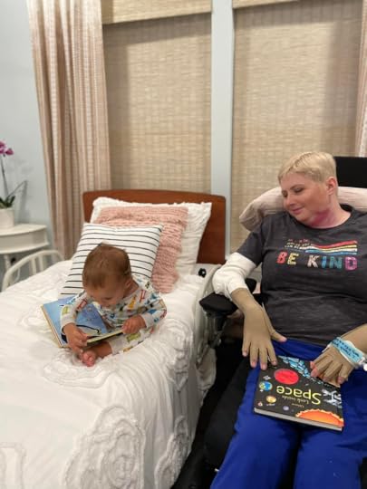 Charlie is such a trooper, she started in her chair today from 10am until 10:30pm, no break! Let me remind you that she has open wounds on her buttocks, from graphs that didn’t take, so it is incredibly painful for her to sit down, and yet she does just in order to participate with our family.