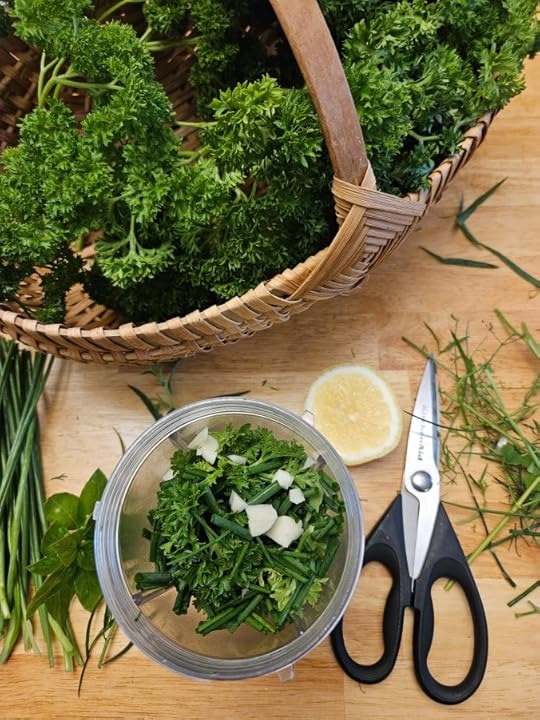 I like mine to present ‘parsley forward’. But a combo of any of these herbs , and in descending amounts will give you serious bang for your herbs: parsley, dill, cilantro, basil, mint and up to a ¼ of that can be chives (or garlic chives). Tender stems are ok as they will break down in the blender/food processor. Some recipes call for anchovies or capers, and I’ve made it with them, but don’t really miss it wtithout.