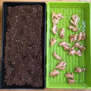 Then, once plumped and possibly sprouting a little more, I���ll plant the rhizomes a few inches deep into some happy, rich well-draining seed starting mix (find my recipe for Seed Starting Mix in my Seed Starting 101 blog) in a seedling tray. I add a mix of worm castings and or sifted compost to the potting mixture to add a boost of nutrients. It usually takes about three weeks to see noticeable buds sprouting on my ginger.
