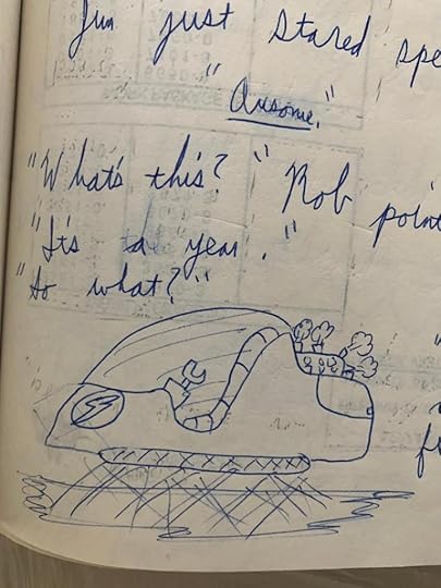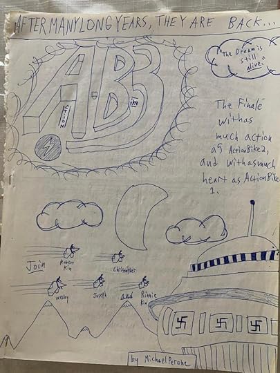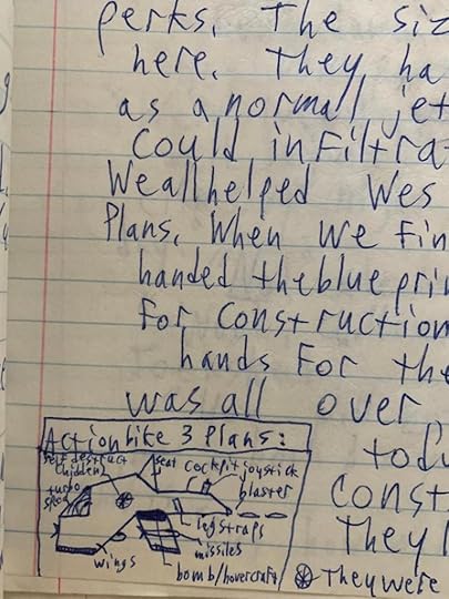 Being older, I had already abandoned the idea to become an artist and started focusing more on writing, which is why this “book” is written on actual ruled paper, not construction paper that’s more appropriate for doodling. Also, besides the cover, I only drew one picture inside: the plans for the new Action Bike.
