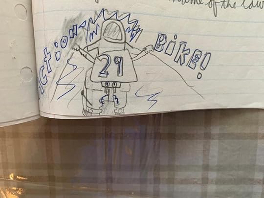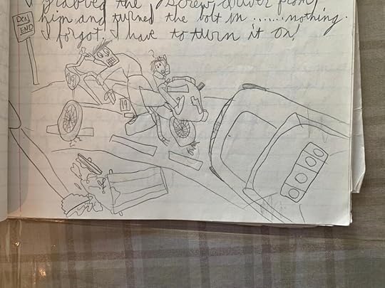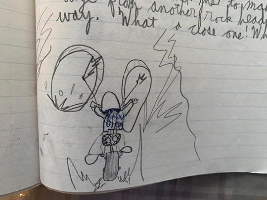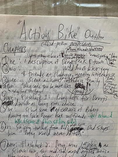 As alluded to in an older blog, here is a snapshot of an early outline for Danger Peak when it was still titled Action Bike. At first, I was a little hesitant to post this behind-the-scenes info since it gives away some of the plot before anyone has had their copy of the book delivered (not even me!), but then I realized no one will be able to read my handwriting anyway. If you can though, congrats! You don’t need glasses!