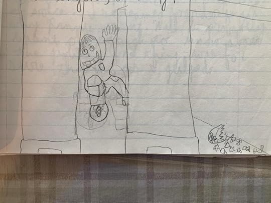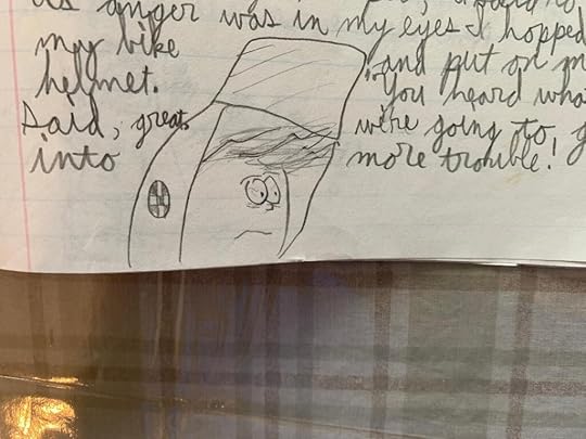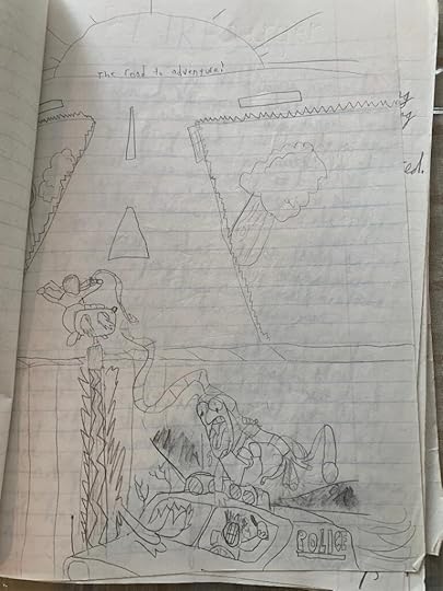 Here is an illustration of one of the action scenes, where Robert and Rinnie narrowly escape the cops by hopping over a wall. (Again, in the novel, they’re trying to outrun their school guards.) I remember being proud of this drawing at the time. (I especially loved the frustrated, mustachioed, cartoony cop in the corner.) Then again, I was 11.