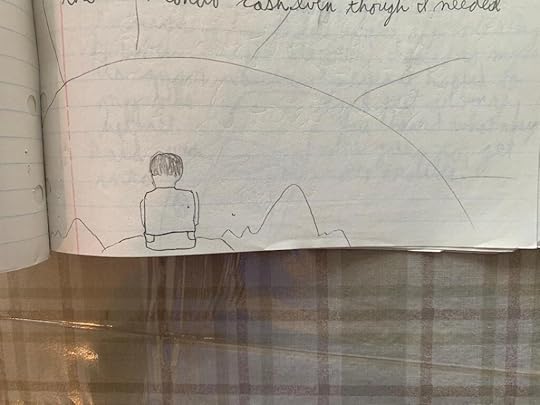 This is from the chapter titled “Determined.” (That chapter title is one of the few things that safely translated to the full-length novel.) In the original version, after getting caught by the cops, Robert spends the night camping outside with them and watches the sun rise, and this inspires him to climb Danger Peak once and for all. Of course, camping out with the cops doesn’t make a lick of sense (hey, I was 11!), so I changed it in the novel to the cops letting Robert off with a strong warning (there’s more to it than that, but I don’t want to give everything away) and escorting him and his friends home. Then, in the middle of the night, Robert wakes up to watch the sun rise from his bedroom window. This version is much more plausible. And that’s why pencils have erasers, kids!