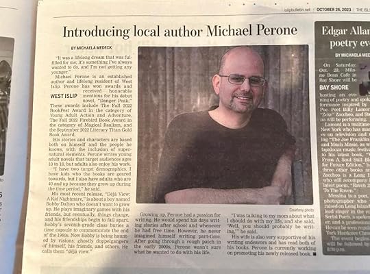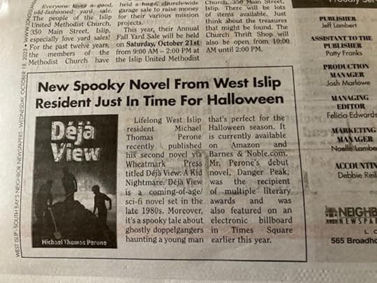 Extry! Extry! It’s hot off the presses, ma’am! And it’ll line your birdcage tomorrow!People who follow my social media channels (Facebook, Twitter/X, Instagram, and A Series of Tubes) will already know this, but since most in WordPress Land don’t, I decided to do a little write-up about how Déjà View is getting written up—in newspapers, that is. Yes, they’re still around! And they’re wonderful! (coming from a former newspaperman myself) Unlike my first novel, Danger Peak, my new one is actually getting some ink—real ink! (not digital) Specifically, there was an announcement about my book’s publication in the October 18th edition of South Bay’s Neighbor, my local newspaper. I was also interviewed by Michaela Medeck for the October 26th issue of The Islip Bulletin, another newspaper here on Lawn Guy Land (translation for those not in the know: Long Island). Truth be told, I actually pitched these papers a mention of Danger Peak when it was first published over a year ago, but they ultimately passed, despite some initial interest. I suppose when Danger Peak won multiple literary awards, including being featured on an electronic billboard in Times Square earlier this year, and my second novel came out, they realized I was serious about this whole writing thing. Here are the articles: