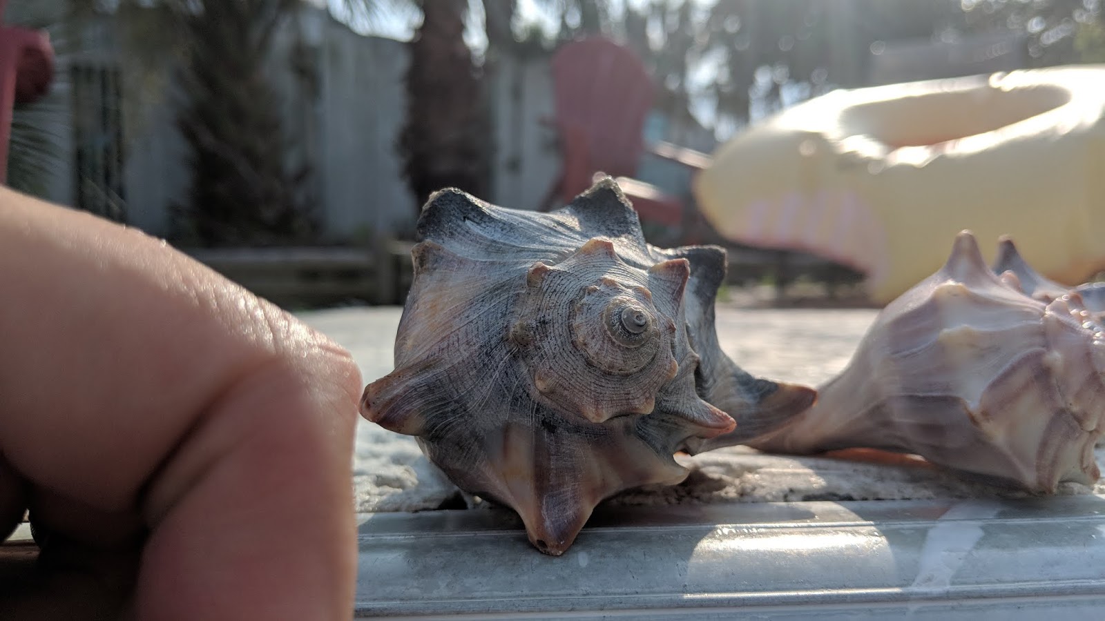 In the first photo, I haven’t really taken the time to frame the shell properly. I didn’t even get my finger out of the frame! Your eyes are drawn to the shell since it’s in the center of the frame, but the image is cluttered by the presence of the second shell, and the background is cluttered. The oddly askew chair and the big yellow pool float are out of focus, but this somehow only makes them more distracting as your eye tries to piece together what it’s seeing. Finally, there’s not a lot of contrast between the shell and the background. It’s pretty much the same color as the fence behind it.