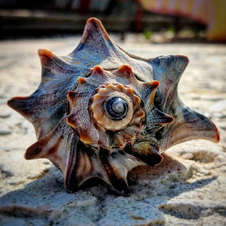 In the second photo, I’ve changed the angle of the shot and have a vastly simplified background. I’ve gotten closer and cropped the image to remove unwanted objects. The new angle means most of the background is lightly colored, making the darker shell stand out. I’ve done some manipulation of the image to oversaturate the colors, making a shell that looked gray at first glance into something far more complex, with tones of blue, brown, and ivory.