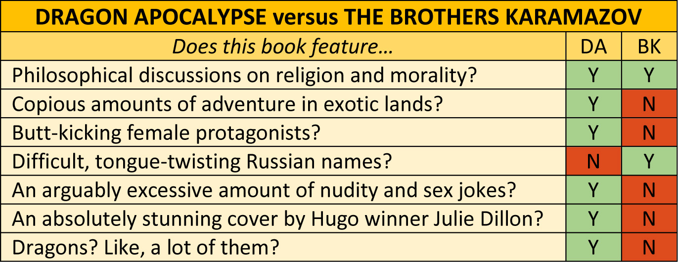 This chart was created by a Piedmont Laureate Emeritus, so you know it's accurate. Look, I'm not saying you should skip reading The Brothers Karamazov in order to read Dragon Apocalypse. Both are fine books! You should really read them both. But start with Dragon Apocalypse. It's got dragons. And apocalypses.