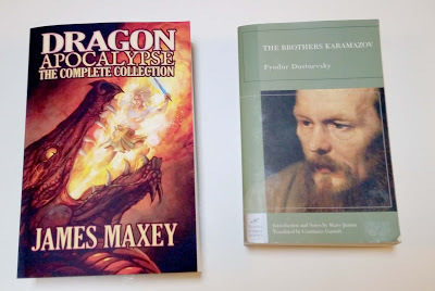 While formatting Dragon Apocalypse, I noticed that the collection was about 460,000 words. I wondered how it stacked up to some of the other long books I'd read, and happened to have The Brothers Karamazov sitting on the bookshelf beside me. I looked it up, and it weighs in at a mere 360,000 words. This surprised me, since when I read The Brothers Karamazov I was under the impression it contained all the words, ever. Don't get me wrong, it's a wonderful book, an enduring literary classic, and there's a good reason it sits next to me. I keep many of my favorite books on a shelf beside my computer so I can glance over at them when I'm writing and remind myself of why I'm putting myself through the headache of creating a book.