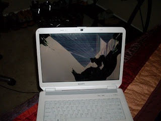 Okay, so he didn't mean to, which technically makes it 2nd degree murder, or maybe even manslaughter, but STILL. My precious laptop, only a year old, was dead deadity dead dead. If you are easily upset by graphic photos, look away now.