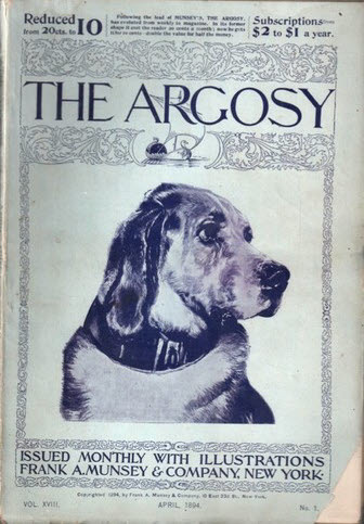 Ashley pegs the first proper pulp as The Argosy, born as The Golden Argosy, a weekly boys’ adventure magazine, in December 1882). The name change in December 1888 was an attempt to attract a more grown-up readership. It moved to the pulp format in April 1894 (the image is the cover of that first pulp issue.) The focus remained on adventure stories, but more serious work was also serialized, such as Upton Sinclair’s novel In the Net of the Visconti.