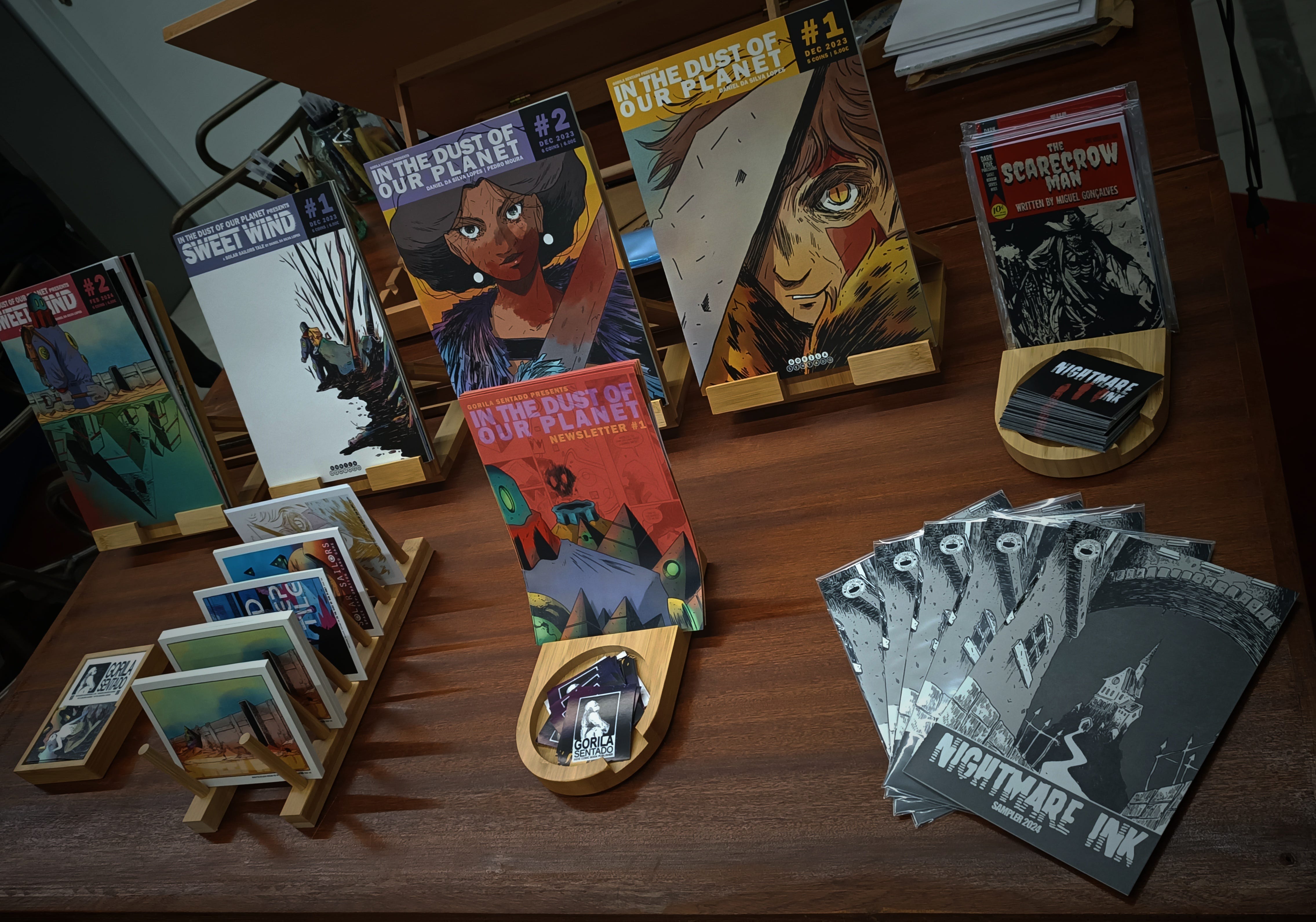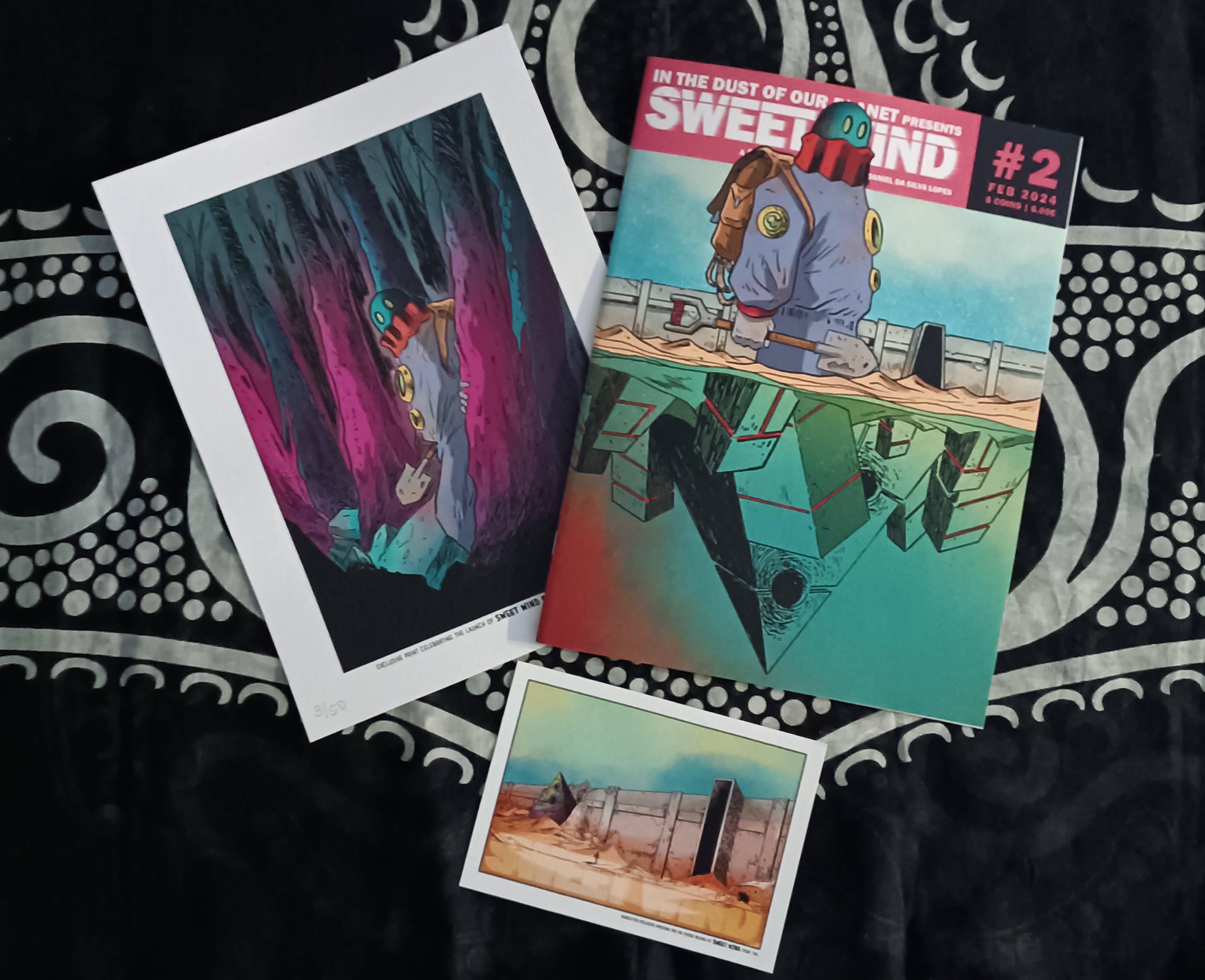 Last, but definitely not least, is Sweet Wind #2 by Daniel da Silva Lopes, who by now is a name known to all of you. This issue continues the adventureof our hero, while he wanders towards his destination. I really like the art in this one especially a double-page spread that Daniel made into the postcard you can see at the bottom of the photo. And did I mention the gorgeous print??