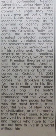Now, about Rolly’s obit: I knew Rolly for 40+ years, and I knew what stories he re-told and those were the ones (and characters) he wold want included re: mom’s bacon sandwiches and his uncle the Atlantic City bookie. I also knew that walking across the Brooklyn Bridge at age 86 fulfilled a life-time dream of his, and in fact the photo we used the top of his obit (and it costs extra) was one I took of Rolly ON the Brooklyn Bridge:
