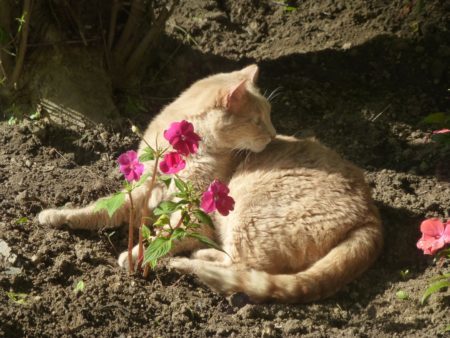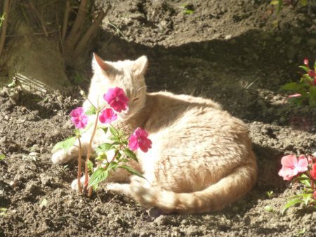 So, on this long Memorial [Three] Day holiday, Top Cat and I put in the annuals (ha! I know I got that right! ANNUALS!), which means the cats think they have a nifty new litter box (with floral accents) in the back yard: